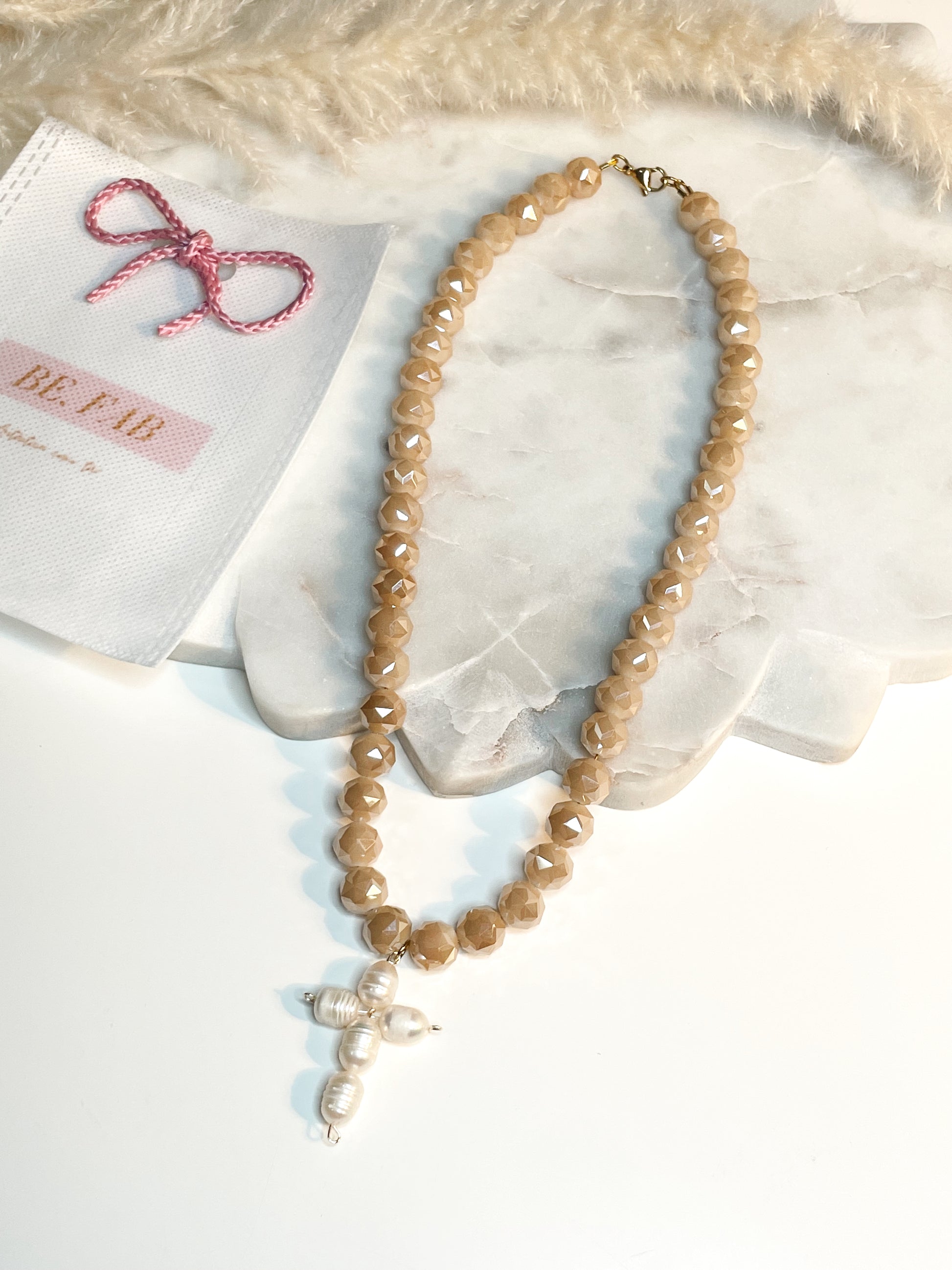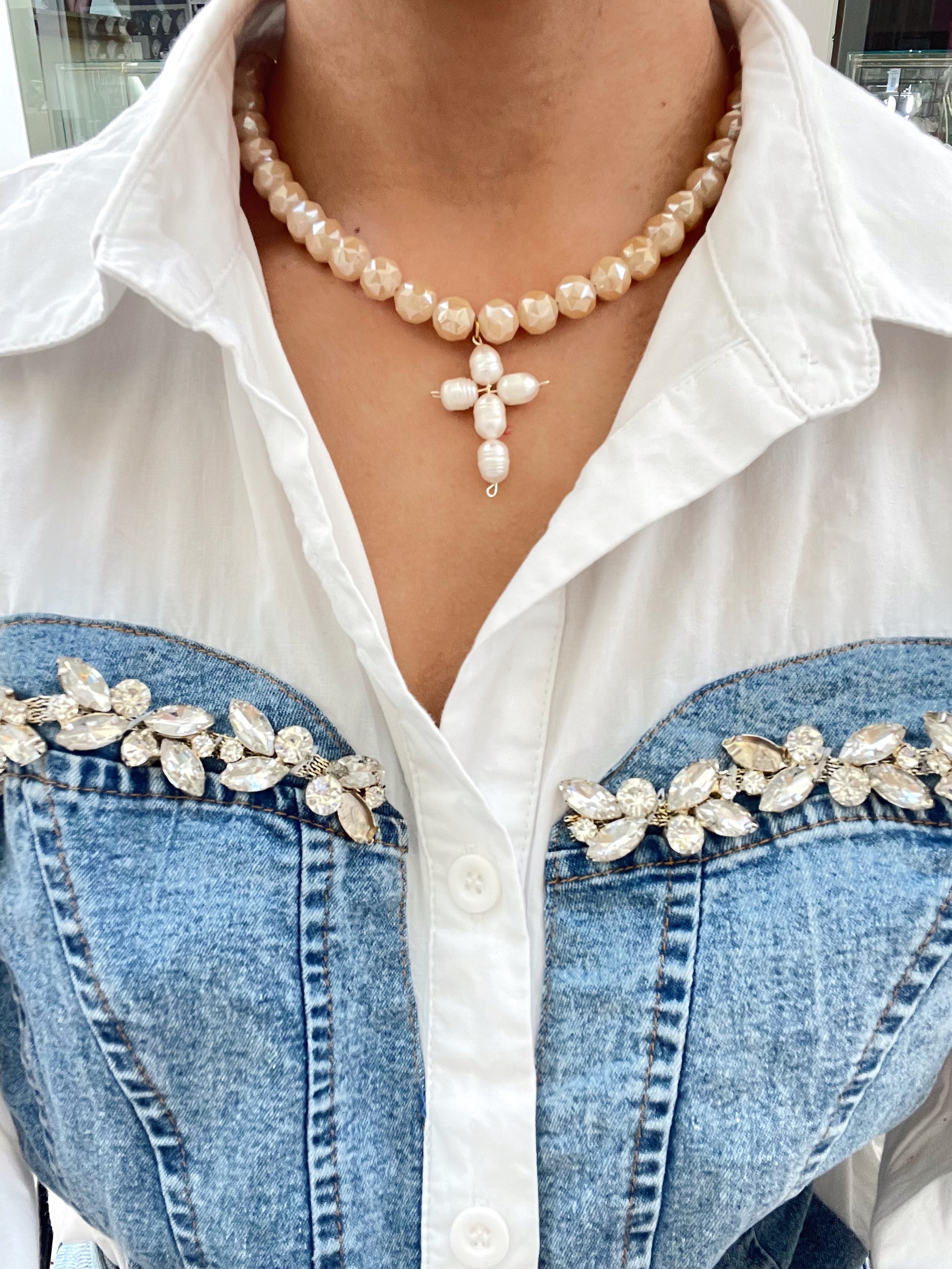 Hermoso collar con cristales color beige y tonalidades tornasol. Cruz de perlas alambrada a mano. Esta pieza nos recuerda que Dios es nuestra esperanza.